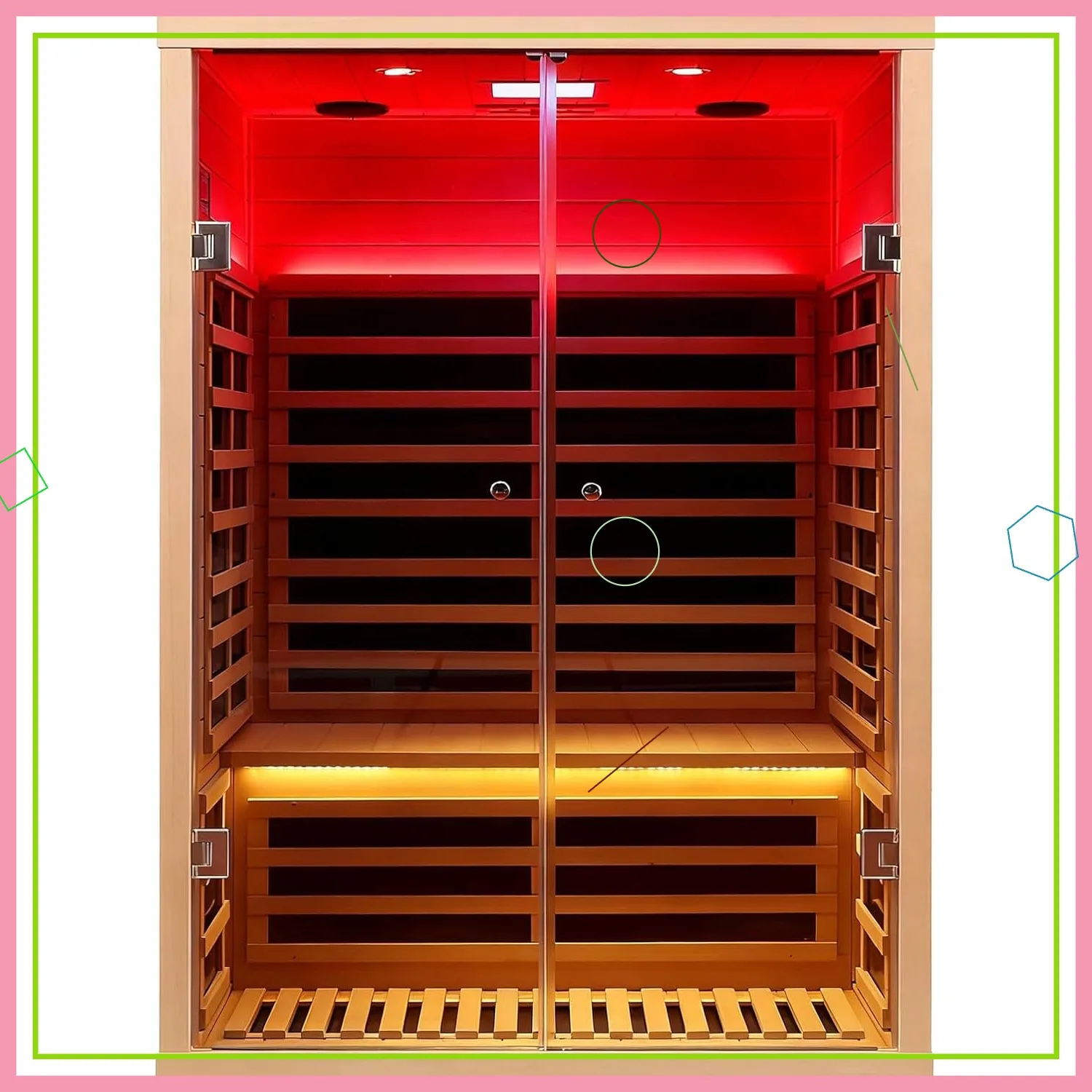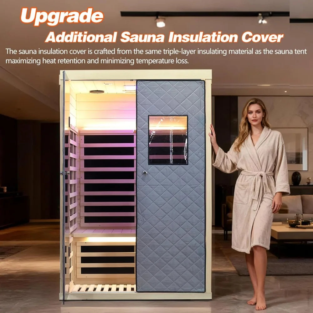 Transform your home into a wellness sanctuary with our premium 2-person far infrared sauna. Designed for ultimate safety and relaxation, this indoor sauna features ultra-low EMF levels (below 5mG), ensuring a healthy detox experience without harmful electromagnetic exposure. The full spectrum infrared technology, powered by 7 carbon crystal heating panels, delivers deep tissue warmth and even heat distribution for effective cardiovascular support, muscle recovery, and stress relief. Crafted from solid Canadian hemlock wood with tongue-and-groove construction, this sauna offers easy assembly and excellent heat retention. It includes two tempered glass doors for an elegant look and measures 47.4"×38.3"×76.4", perfectly sized for home use. Smart controls via an LCD touch panel or Bluetooth mobile app allow you to customize your session effortlessly. Enhance your relaxation with built-in chromotherapy lighting in 7 colors and Bluetooth speakers for immersive audio. Two reading lights provide additional illumination, creating the ideal space for meditation or unwinding after a long day. Safety is prioritized with overload protection and automatic shut-off features. This complete home sauna package operates at 1780W/110-120VAC with a standard plug, making installation simple in any suitable indoor area. Reach temperatures up to 145°F efficiently for optimal detox benefits. Please note: This is a large item shipped via freight; ensure a valid phone number is provided for delivery scheduling and monitor messages for updates. Backed by reliable warranty coverage—1 year on the wooden structure and 2 years on electronic components against manufacturing defects—we are committed to your satisfaction. In case of shipping damage, follow instructions to provide evidence for prompt replacement parts.