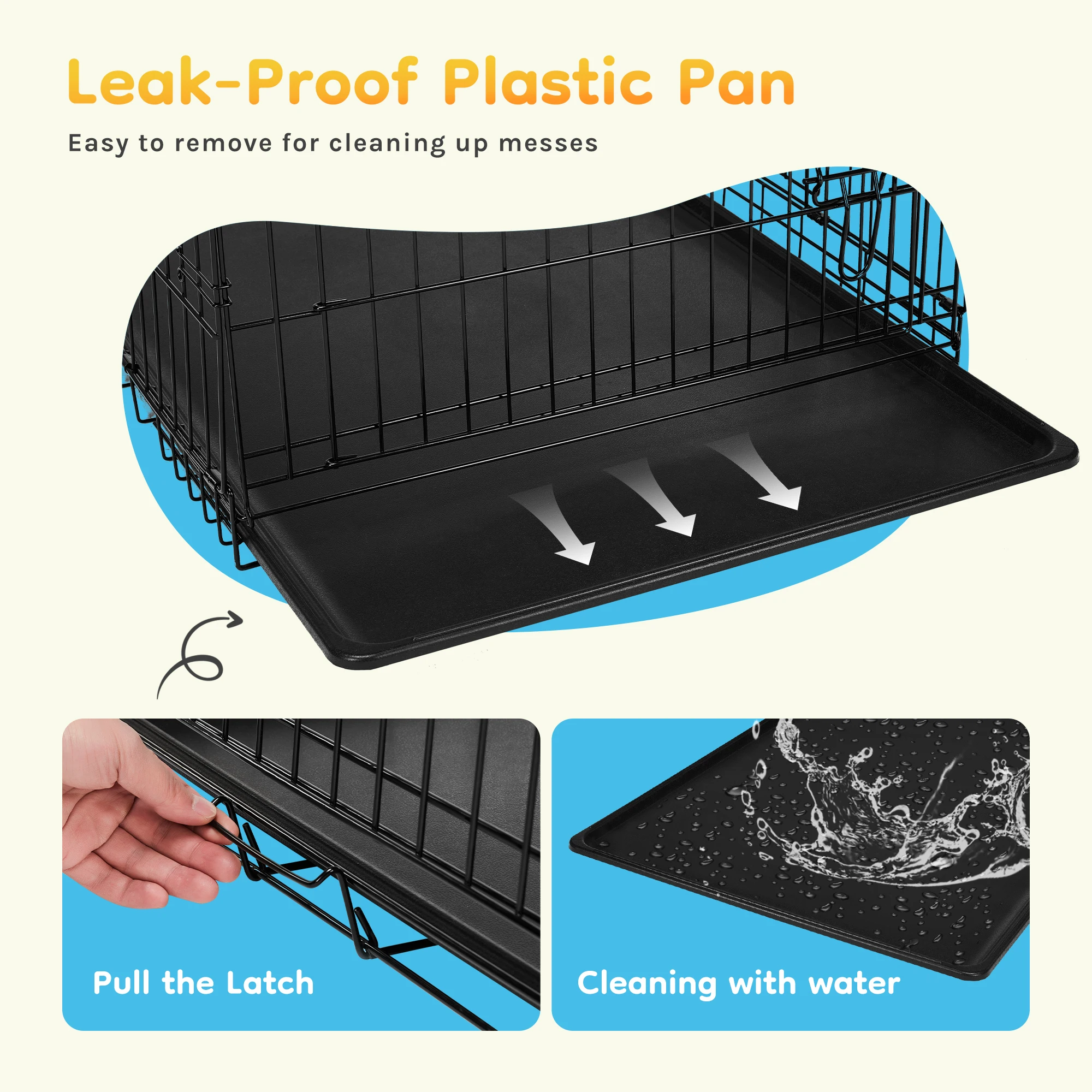 【EASY TO CLEAN】 The crate bottom comes with a plastic removable tray that features a deep lip design to prevent overflow, that will not stain, warp, corrode or retain pet odors, you can cover the pad or wipe off pet's feces, and just slide it out when you need to clean. Meanwhile, the whole cage can also be cleaned by wiping to saving you time.